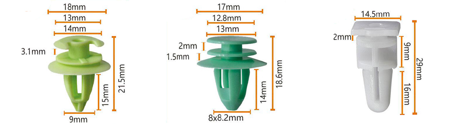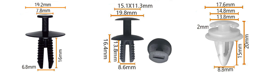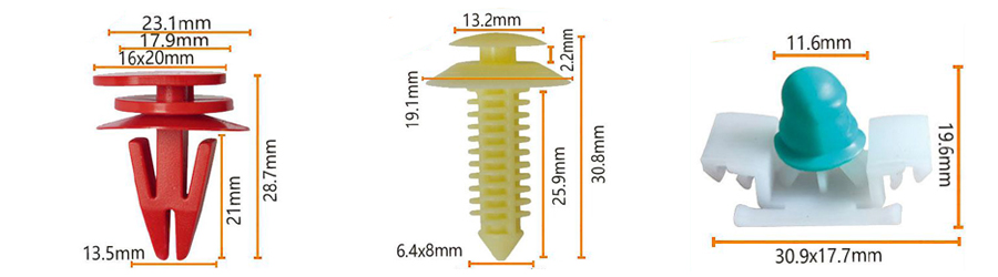 کلیپ های انتشار سریع پلاستیکی: برای رفع پانل های بدنه ، ضربه گیر ، آستر قوس چرخ و غیره استفاده می شود. این کلیپ ها معمولاً از پلاستیک های با مقاومت در برابر درجه حرارت بالا ساخته شده اند و با یک عملکرد سریع آزاد طراحی شده اند و ترمیم یا تعویض قطعات را آسان می کنند.